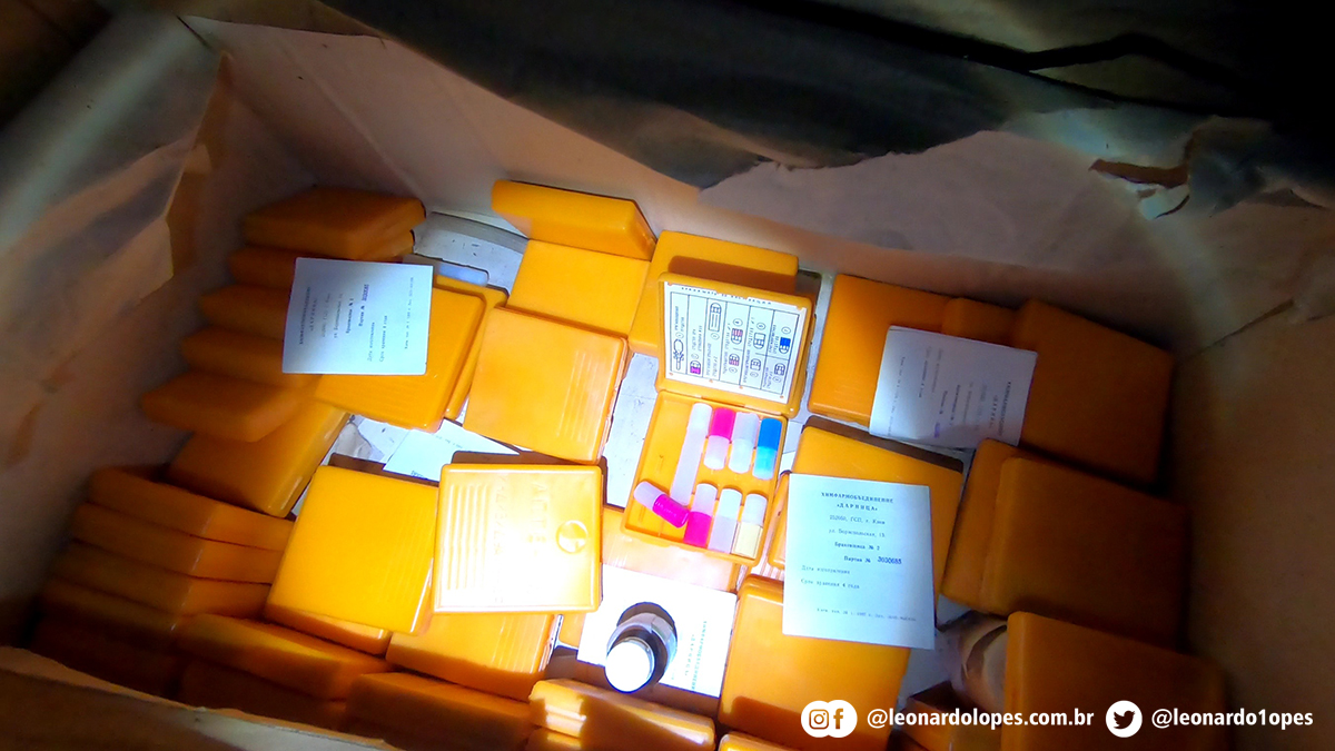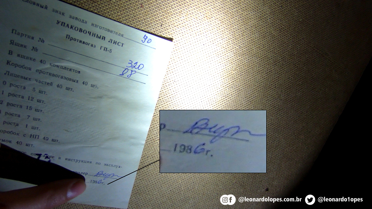 Após o desastre de Chernobyl, estes bunkers receberam carregamentos extras de máscaras, suprimentos e equipamentos. Esta caixa, por exemplo, foi enviada em Agosto de 1986, quatro meses após o desastre, período em que ainda temiam uma segunda grande explosão.